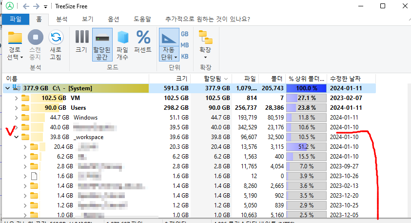 하위 폴더를 열면 그 폴더의 내부에서의 차지비율 %가 나온다.