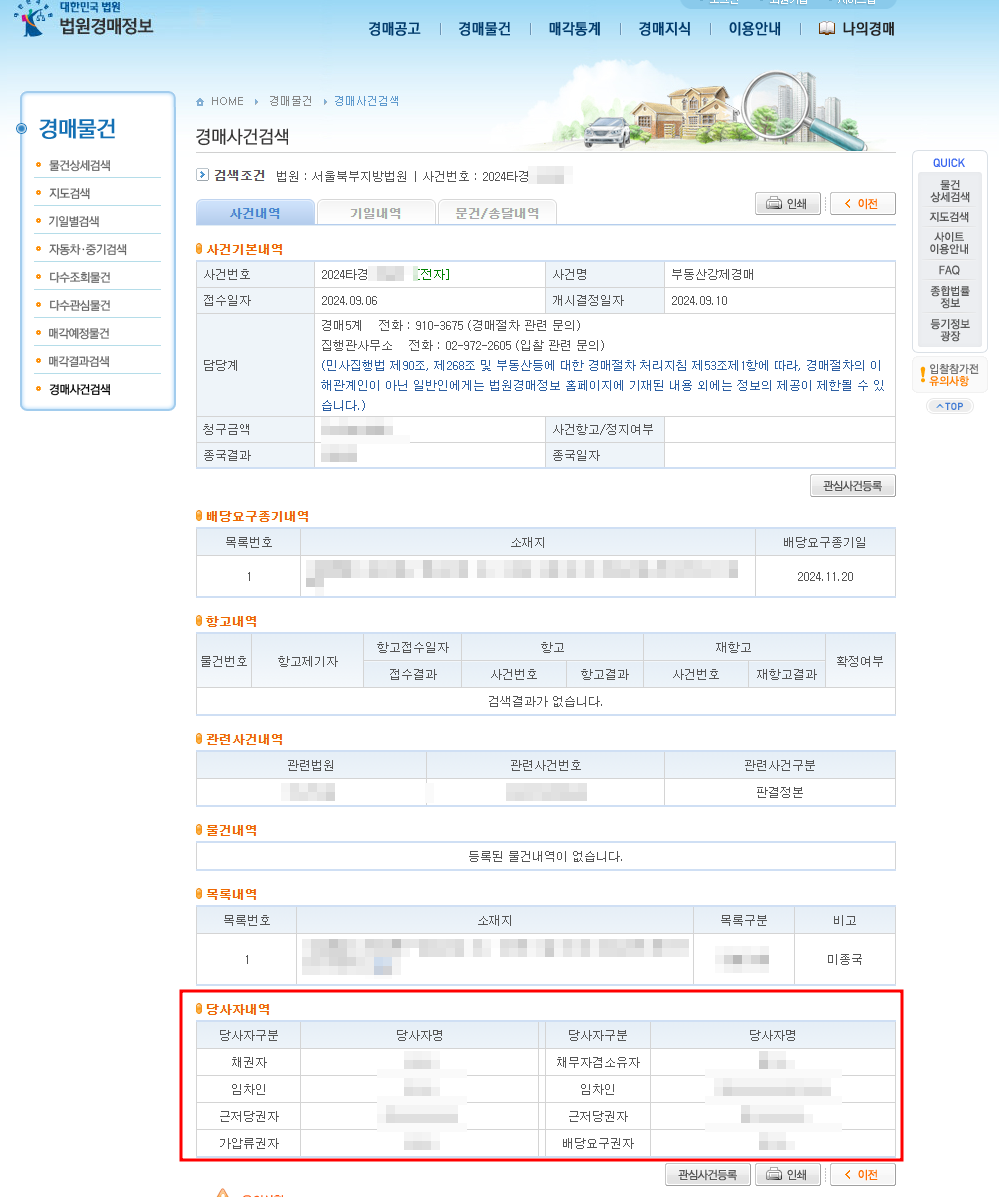 3. 아래와 같이 사건과 근저당권자, 배당요구자들을 확인할 수 있다.
