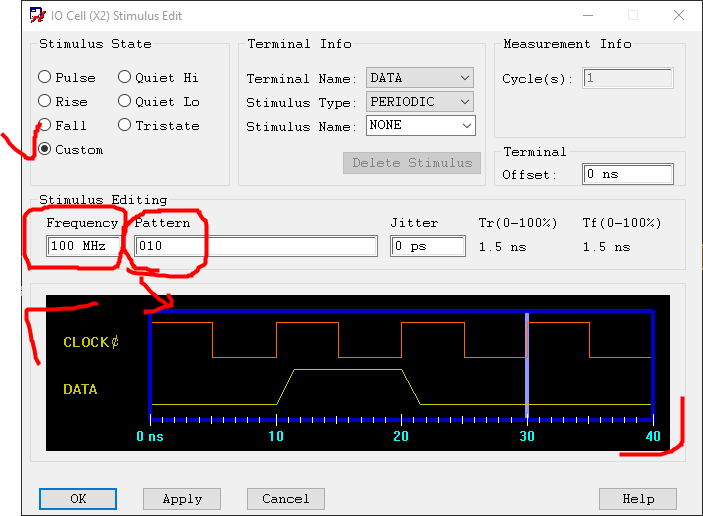 원하는 주파수와 테스트 패턴을 정하면 아래와 같이 그래픽적으로 수정된다.