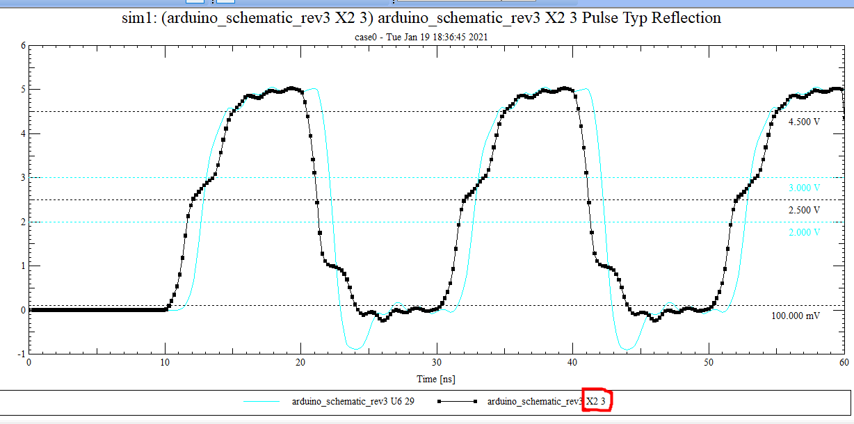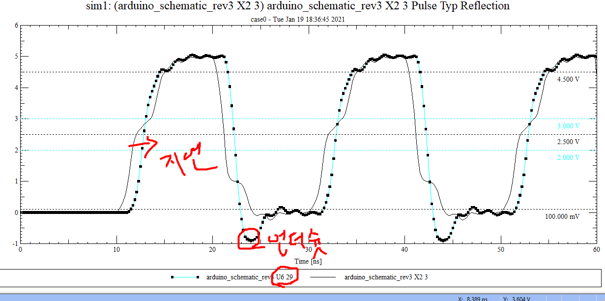 U6의 29번핀, 즉 Receiver에서 받은 파형 (delay와 undershoot 까지 있다)