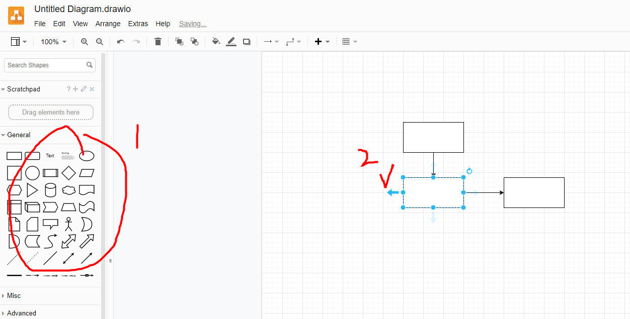 1. 왼쪽에 원하는 도형을 선택하고 마우스를 대보면 화살표가 나온다. 화살표를 눌러 도형을 선택하면 생성 가능