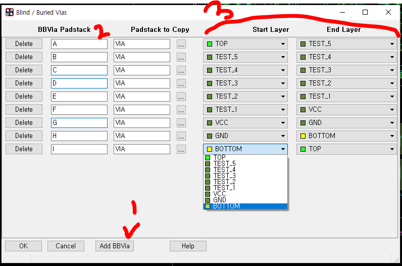 2. Add BBvia(1)를 눌러 아래와 같이 원하는 via를 추가한다.