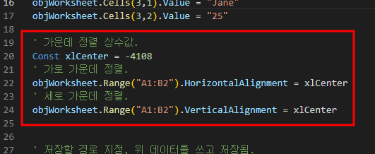 [Visual Basic] 비주얼베이직 스크립트 (VBScript), 엑셀 가운데 정렬하기 (0) | 2023.03.29 |