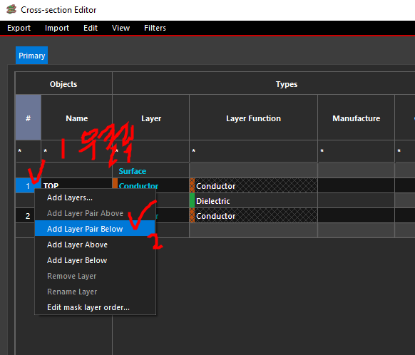 Add Layer Pair Above : 위칸으로 1개의 layer 추가 (conductor 레이어)